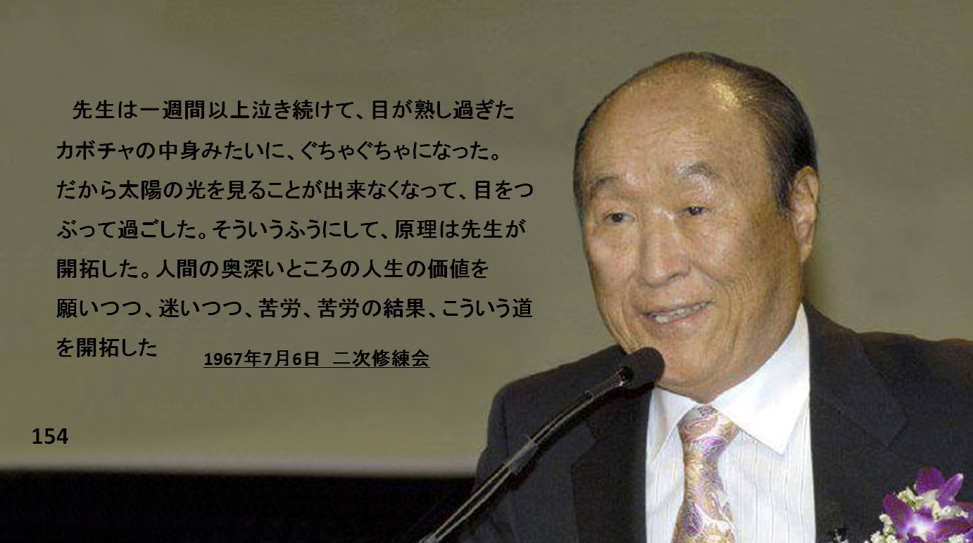 先生は一週間以上泣き続けて、目が熟し過ぎたカボチャの中身みたいに、ぐちゃぐちゃになった。だから太陽の光を見ることが出来なくなって、目をつぶって過ごした。そういうふうにして、原理は先生が開拓した。君達、想像もつかないだろう。人間の奥深いところの人生の価値を願いつつ、迷いつつ、苦労、苦労の結果、こういう道を開拓した。君達霊通してみれば先生の価値は量り知れないことが分かる。先生に忠孝を尽くせということを神が千万編も命じる。世界に広がっている全ての霊通者たちは先生の弟子になっていること君達分かっている? 何故こういうふうになったんだろうか。涙の結晶として生まれて来た道、命を懸ける。千万編も命を懸けることが、この道を行くことであるというんだね。先生は一歩も退くことは出来ない