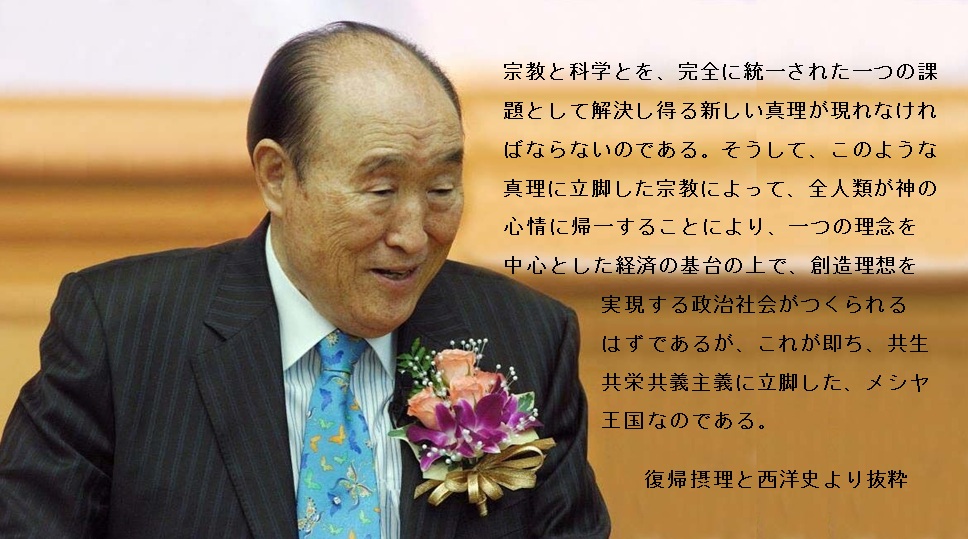 従って、このように、三つの部面に分かれて発展してきた歴史が、一つの理想を実現する焦点に向かって帰結されるためには、宗教と科学とを、完全に統一された一つの課題として解決し得る新しい真理が現れなければならないのである。そうして、このような真理に立脚した宗教によって、全人類が神の心情に帰一することにより、一つの理念を中心とした経済の基台の上で、創造理想を実現する政治社会がつくられるはずであるが、これが即ち、共生共栄共義主義に立脚した、メシヤ王国なのである。