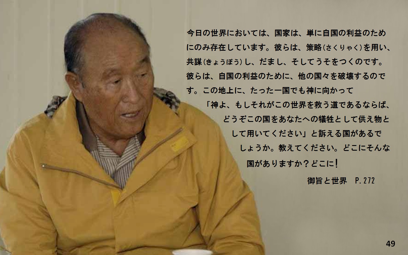 今日の世界においては、国家は、単に自国の利益のためにのみ存在しています。彼らは、策略を用い、共謀し、だまし、そしてうそをつくのです。彼らは、自国の利益のために、他の国々を破壊するのです。この地上に、たった一国でも神に向かって「神よ、もしそれがこの世界を救う道であるならば、どうぞこの国をあなたへの犠牲として供え物として用いてください」と訴える国があるでしょうか。教えてください。どこにそんな国がありますか?どこに?