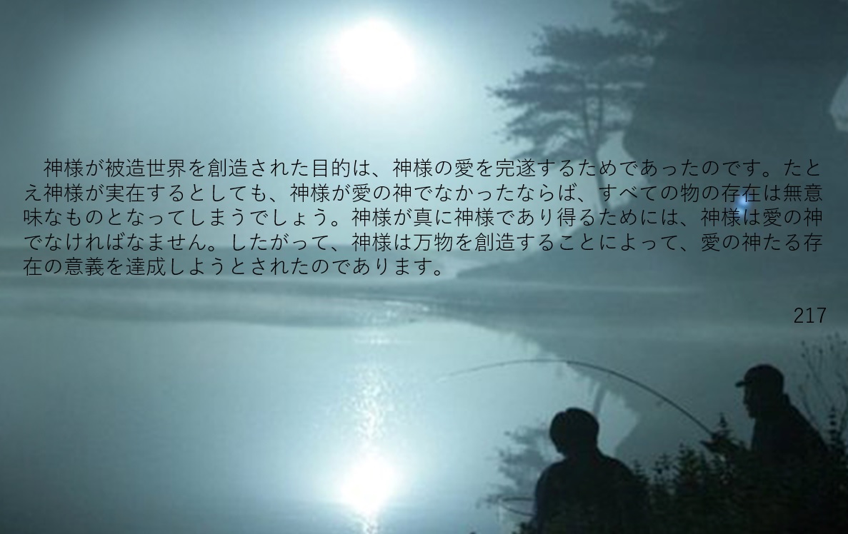神様が被造世界を創造された目的は、神様の愛を完遂するためであったのです。たとえ神様が実在するとしても、神様が愛の神でなかったならば、すべての物の存在は無意味なものとなってしまうでしょう。神様が真に神様であり得るためには、神様は愛の神でなければなません。したがって、神様は万物を創造することによって、愛の神たる存在の意義を達成しようとされたのであります。
