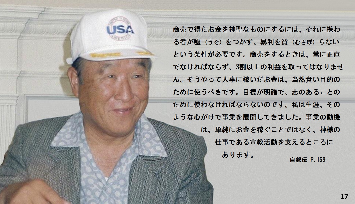 商売をして集めたお金は神聖なお金です。しかし、商売で得たお金を神聖なものにするには、それに携わる者が嘘をつかず、暴利を貧らないという条件が必要です。 商売をするときは、常に正直でなければならず、3割以上の利益を取ってはなりません。そうやって大事に稼いだお金は、当然貴い目的のために使うべきです。目標が明確で、志のあることのために使わなければならないのです。私は生涯、そのような心がけで事業を展開してきました。事業の動機は、単純にお金を稼ぐことではなく、神様の仕事である宣教活動を支えるところにあります。