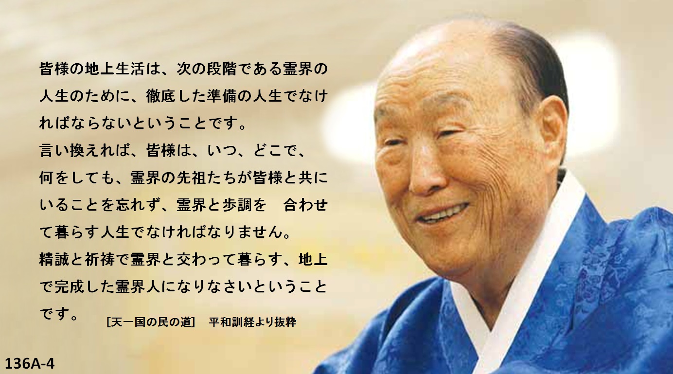 言い換えれば、皆様は、いつ、どこで、何をしても、霊界の先祖たちが皆様と共にいることを忘れず、霊界と歩調を合わせて暮らす人生でなければなりません。精誠と祈祷で霊界と交わって暮らす、地上で完成した霊界人になりなさいということです。