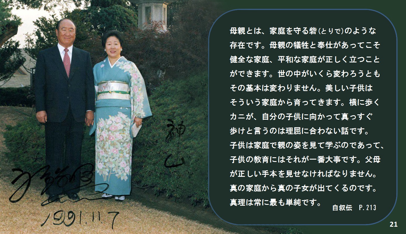 母親とは、家庭を守る砦のような存在です。母親の犠牲と奉仕があってこそ健全な家庭、平和な家庭が正しく立つことができます。世の中がいくら変わろうともその基本は変わりません。美しい子供はそういう家庭から育ってきます。横に歩くカニが、自分の子供に向かって真っすぐ歩けと言うのは理屈に合わない話です。子供は家庭で親の姿を見て学ぶのであって、子供の教育にはそれが一番大事です。父母が正しい手本を見せなければなりません。真の家庭から真の子女が出てくるのです。真理は常に最も単純です。