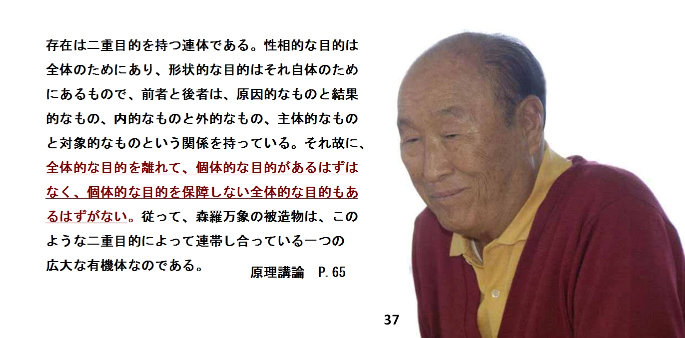 存在は二重目的を持つ連体である。性相的な目的は全体のためにあり、形状的な目的はそれ自体のためにあるもので、前者と後者は、原因的なものと結果的なもの、内的なものと外的なもの、主体的なものと対象的なものという関係を持っている。それ故に、全体的な目的を離れて、個体的な目的があるはずはなく、個体的な目的を保障しない全体的な目的もあるはずがない。従って、森羅万象の被造物は、このような二重目的によって連帯し合っている一つの広大な有機体なのである。