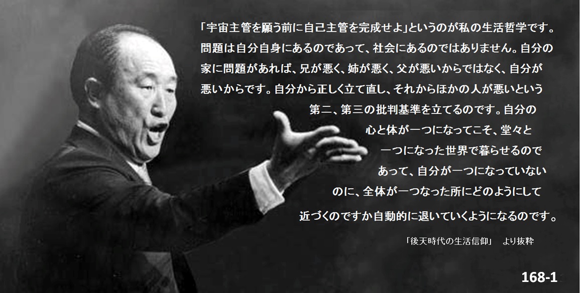 問題は自分自身にあるのであって、社会にあるのではありません。自分の家に問題があれば、兄が悪く、姉が悪く、父が悪いからではなく、自分が悪いからです。自分から正しく立て直し、それからほかの人が悪いという第二、第三の批判基準を立てるのです。自分の心と体が一つになってこそ、堂々と一つになった世界で暮らせるのであって、自分が一つになっていないのに、全体が一つなった所にどのようにして近づくのですか。自動的に退いていくようになるのです。心を踏みにじり、心を否定し、心を苦しめ、心を締めつける体が主人になってはいけない、という事実を知らなければなりません。体を捕まえて、心のように「ために生きる」ようになったときには、幸福が訪れてきます。ここに神様が臨在されるのです。(201-353)