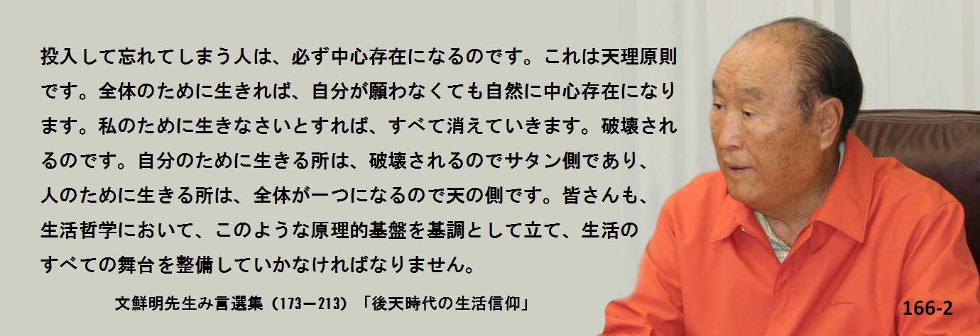 投入して忘れてしまう人は、必ず中心存在になるのです。これは天理原則です。皆さんの兄弟なら兄弟、友人なら友人の中でも、全体のために生きれば、自分が願わなくても自然に中心存在になります。私のために生きなさいとすれば、すべて消えていきます。破壊されるのです。自分のために生きる所は、破壊されるのでサタン側であり、人のために生きる所は、全体が一つになるので天の側です。皆さんも、生活哲学において、このような原理的基盤を基調として立て、生活のすべての舞台を整備していかなければなりません。