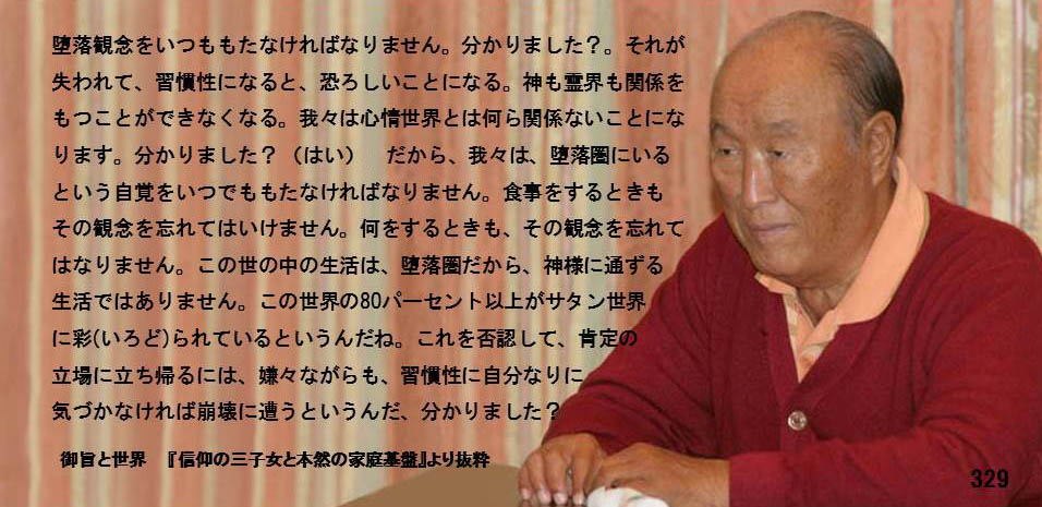 だから、堕落観念をいつももたなければなりません。分かりました? それをもたないと、とんでもないことになる。それが失われて、習慣性になると、恐ろしいことになる。神も霊界も関係をもつことができなくなる。我々は心情世界とは何ら関係ないことになります。分かりました? (はい)。 だから、我々は、堕落圏にいるという自覚をいつでももたなければなりません。食事をするときもその観念を忘れてはいけません。何をするときも、その観念を忘れてはなりません。