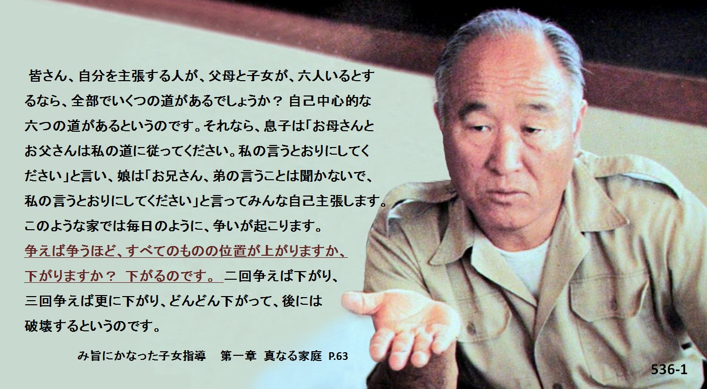 皆さん、自分を主張する人が、父母と子女が、六人いるとするなら、全部でいくつの道があるでしょうか? 自己中心的な六つの道があるというのです。それなら、息子は「お母さんとお父さんは私の道に従ってきてください。私の言うとおりにしてください」と言い、娘は「お兄さん、弟の言うことは聞かないで、私の言うとおりにしてください」と言ってみんな自己主張します。このような家では毎日のように、争いが起こります。争えば争うほど、すべてのものの位置が上がりますか、下がりますか? 下がるのです。二回争えば下がり、三回争えば更に下がり、どんどん下がって、後には破壊するというのです。これは事実ですか? 「そうではない、われわれは争って上がっていくのだ。これが原則だ」と言うのはどうですか? (違います)