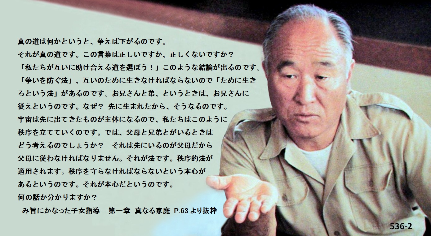 さあ、先生の言うことは間違っていると言う人は手を挙げてみなさい。先生が聞いてみますよ。だから、ここでどんな結論が出てくるでしょうか? 「私たちが互いに助け合える道を選ぼう!」このような結論が出るのです。嫌でも、そういう結論を出さなければなりません。互いに利益になりうるとするなら、下がっていく道ですか、上がっていく道ですか? (上がっていく道です)。したがって、上がっていくことのできる道を中心とした共同利益が絶対必要だ、こういう結論が出てくるのです。では、上がっていってどこに行くのでしょうか? 家庭が上がっていこうとすれば社会のためになりうる道に従っていかなければならないし、国が上がっていこうとすれば世界のためになりうる道に従っていかなければならないし、世界が上がっていこうとすれば、世界以上があるならそこのためになりうる道に従っていかなければなりません。ところで「それは間違いだ。それは違う。違う」このように否定しようとするのです。しかし、それは事実です。(一九八二・三・七、世界宣教本部)