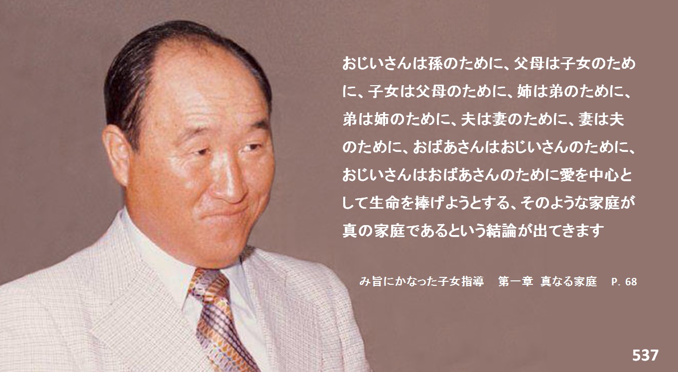 だから、おじいさんを愛して、おじいさんを尊敬することは過去をすべて引き継いで過去の世の中を学ぶことです。お父さんからは現在を学ぶのであり、子女を愛することは、子女たちを尊く思うことは未来を学んでいくことなのです。おじいさんを通じて、お母さんとお父さんを通じて何を引き継ぐのか、何の血統を引き継ぐのかと言えば真の愛です。真の愛を引き継ぐのです。おじいさんとおばあさんは年取っているけれども、二人は真の愛で一つになっており、お母さんとお父さんが一つになっているので、私たちもあのようになって未来を引き継ごうというのです。未来を引き継ぐために…。絶対に、真の家庭にならずしては未来を引き継ぐことができないということを知らなければなりません。家庭のこの三つを見るとき、それは宇宙を見るのと同じです。宇宙の愛は神様からの全体歴史、現在と未来を代表した真の家庭にあるのです。真の家庭でおばあさんを愛し、お母さんを愛し、お姉さんを愛するから…。動物世界を見ても雌を愛し、雄を愛し、全部がこのようになるのです。これは何かと言えば、宇宙の愛を学ぶことのできる教科書です。おばあさんがいなければ不安定なのです。おじいさんがいなくても不安定だし、だれがいなくても同じです。このようになってはじめて、そのまま天の国に移っていくのです。真の祖父母を愛し、真の父母を愛し、真の子女、真の家庭、真の国家、真の宇宙を愛した人が天国に行くのです。その模型教科書が家庭です。