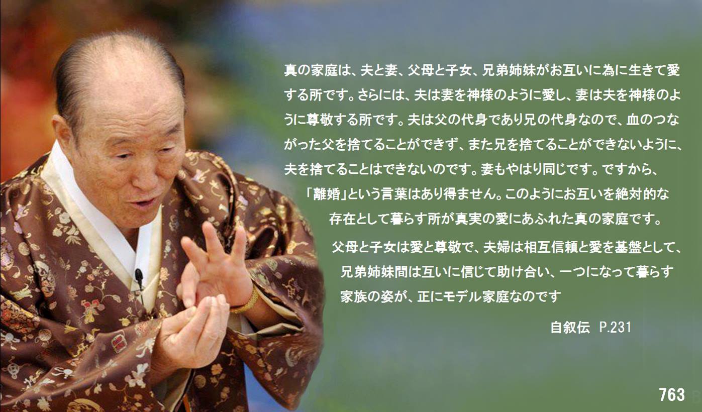 真の家庭は、夫と妻、父母と子女、兄弟姉妹がお互いに為に生きて愛する所です。さらには、夫は妻を神様のように愛し、妻は夫を神様のように尊敬する所です。夫は父の代身であり兄の代身なので、血のつながった父を捨てることができず、また兄を捨てることができないように、夫を捨てることはできないのです。妻もやはり同じです。ですから、「離婚」という言葉はあり得ません。このようにお互いを絶対的な存在として暮らす所が真実の愛にあふれた真の家庭です。