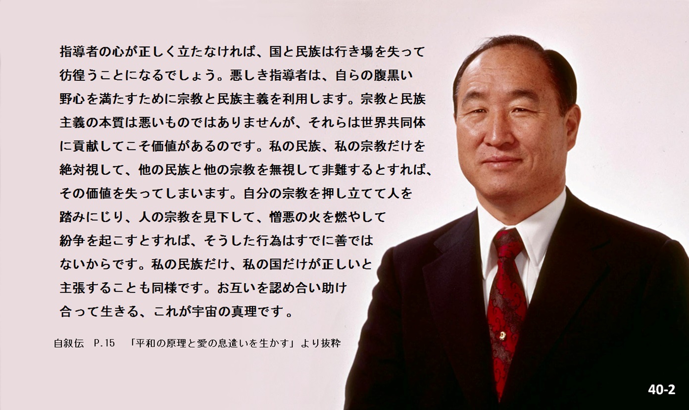 指導者の心が正しく立たなければ、国と民族は行き場を失って彷徨うことになるでしょう。悪しき指導者は、自らの腹黒い野心を満たすために宗教と民族主義を利用します。宗教と民族主義の本質は悪いものではありませんが、それらは世界共同体に貢献してこそ価値があるのです。私の民族、私の宗教だけを絶対視して、他の民族と他の宗教を無視して非難するとすれば、その価値を失ってしまいます。自分の宗教を押し立てて人を踏みにじり、人の宗教を見下して、憎悪の火を燃やして紛争を起こすとすれば、そうした行為はすでに善ではないからです。私の民族だけ、私の国だけが正しいと主張することも同様です。
