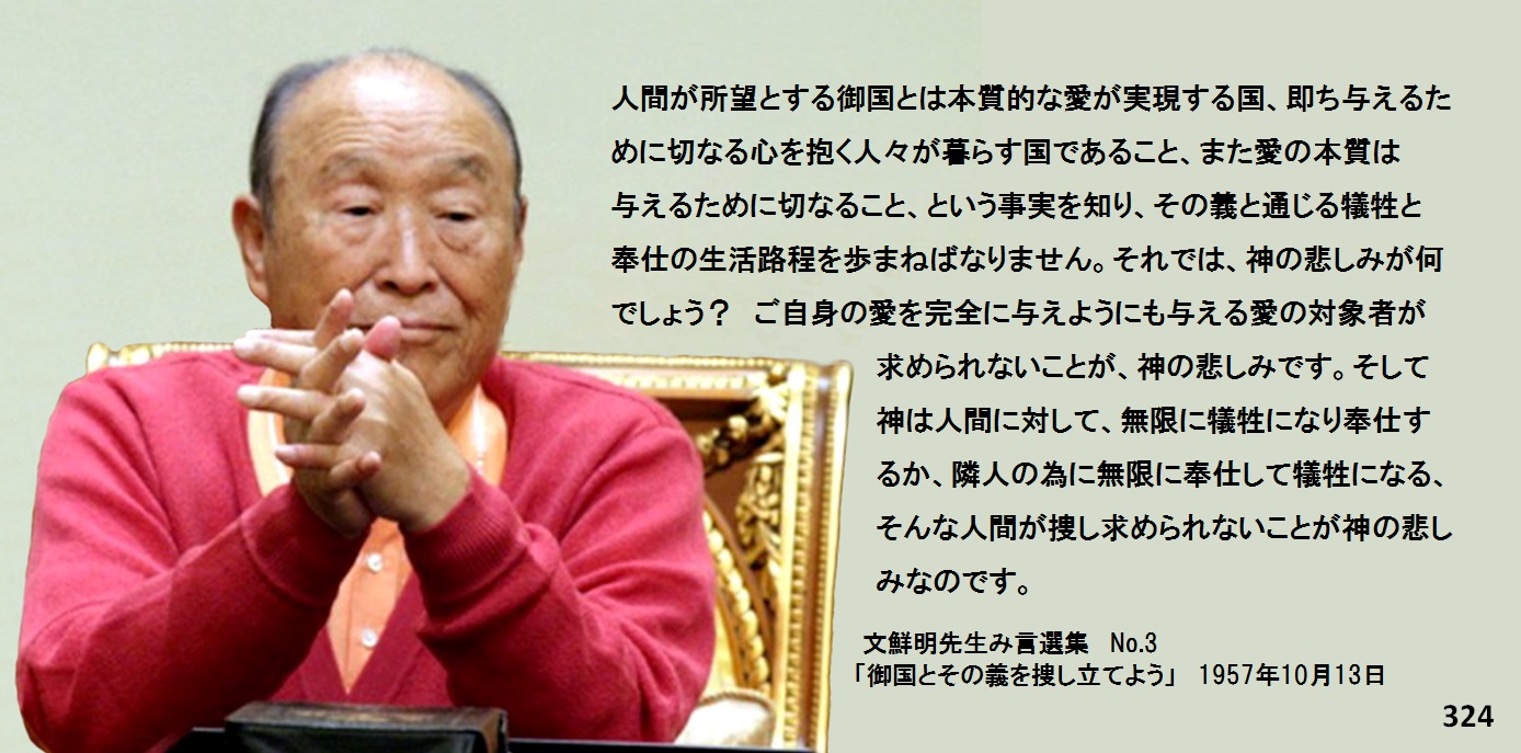 今日皆さんは、人間が所望とする御国とは本質的な愛が実現する国、即ち与えるために切なる心を抱く人々が暮らす国であること、また愛の本質は与えるために切なること、という事実を知り、その義と通じる犠牲と奉仕の生活路程を歩まねばなりません。