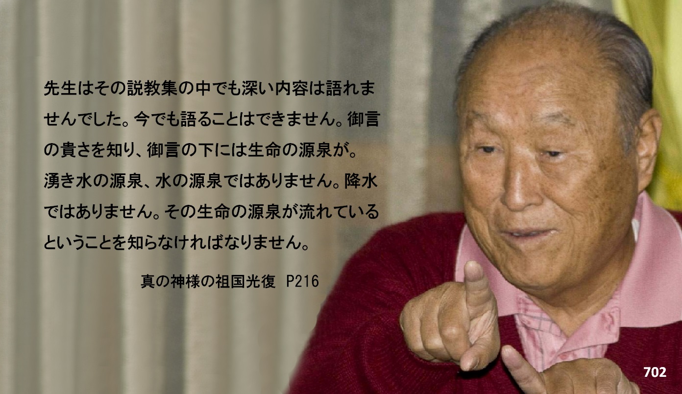 「今までの先生の説教をまとめた説教集をすべて読んだ人は手を上げてみなさい。こら!どんな教育をしたのですか、協会長。先生はその説教集の中でも深い内容は語れませんでした。今でも語ることはできません。御言の貴さを知り、御言の下には生命の源泉が、湧き水の源泉、水の源泉ではありません。降水ではありません。その生命の源泉が流れているということを知らなければなりません。自分個人の家にその湧き水のパイプをひいて永遠の生命水が湧き出すような道を模索してみなければならないというのが、統一家の群れの責任であるのに、何をしてきたのですか。あれはみな古物屋に売る本なのか・・。」