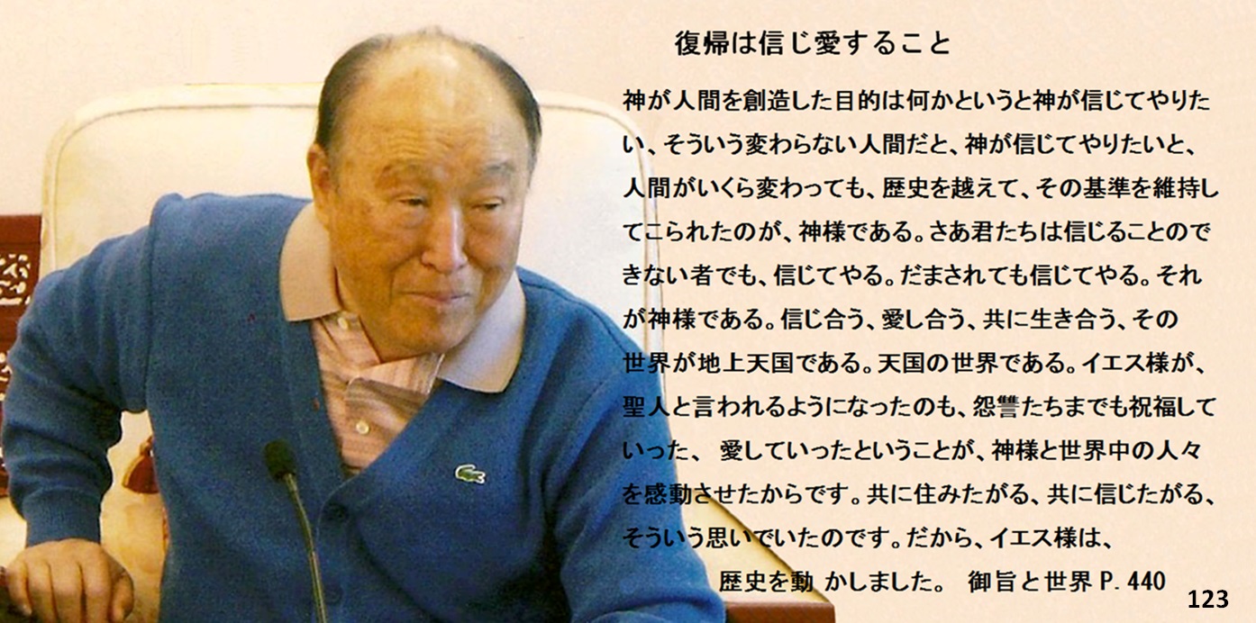 愛してやる、共に住みたがる。お父さんもそうだよ。父母がそうでしょう。信じられない者を信じてやる。その基準において、変わらない純粋な人間、そのような人にならないといけないということを我々は知っております。本当の人、真の人はその基準において、一致したところにおいて、満たすことができるのではないか。そういう人同士、信じ合う、愛し合う、共に生き合う、その世界が地上天国である。天国の世界である。君たちもそうでしょう。神様みたいな人を、旦那さんに、奥さんにと願うでしょう。それは同じである。