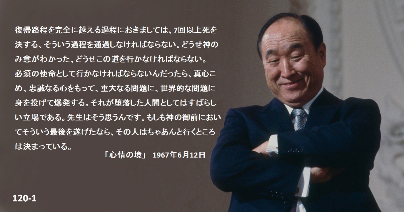だから復帰路程を完全に越える過程におきましては、7回以上死を決する、そういう過程を通過しなければならない。どうせ神のみ意がわかった、どうせこの道を行かなければならない。必須の使命として行かなければならないんだったら、真心こめ、忠誠なる心をもって、重大なる問題に、世界的な問題に身を投げて爆発する。それが堕落した人間としてはすばらしい立場である。先生はそう思うんです。もしも神の御前においてそういう最後を遂げたなら、その人はちゃあんと行くところは決まっている。
