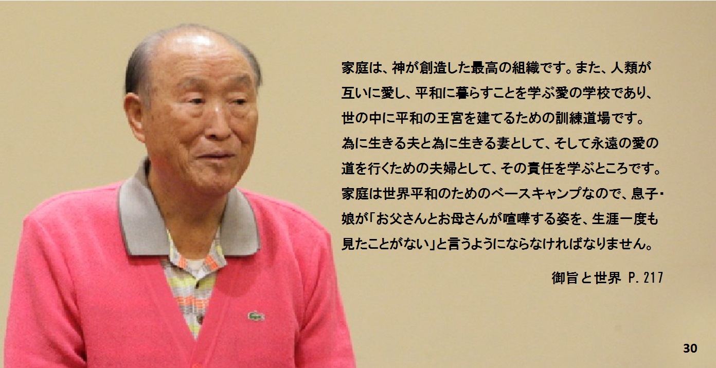 家庭は、神が創造した最高の組織です。また、人類が互いに愛し、平和に暮らすことを学ぶ愛の学校であり、世の中に平和の王宮を建てるための訓練道場です。為に生きる夫と為に生きる妻として、そして永遠の愛の道を行くための夫婦として、その責任を学ぶところです。家庭は世界平和のためのべースキャンプなので、息子・娘が「お父さんとお母さんが喧嘩する姿を、生涯一度も見たことがない」と言うようにならなければなりません。