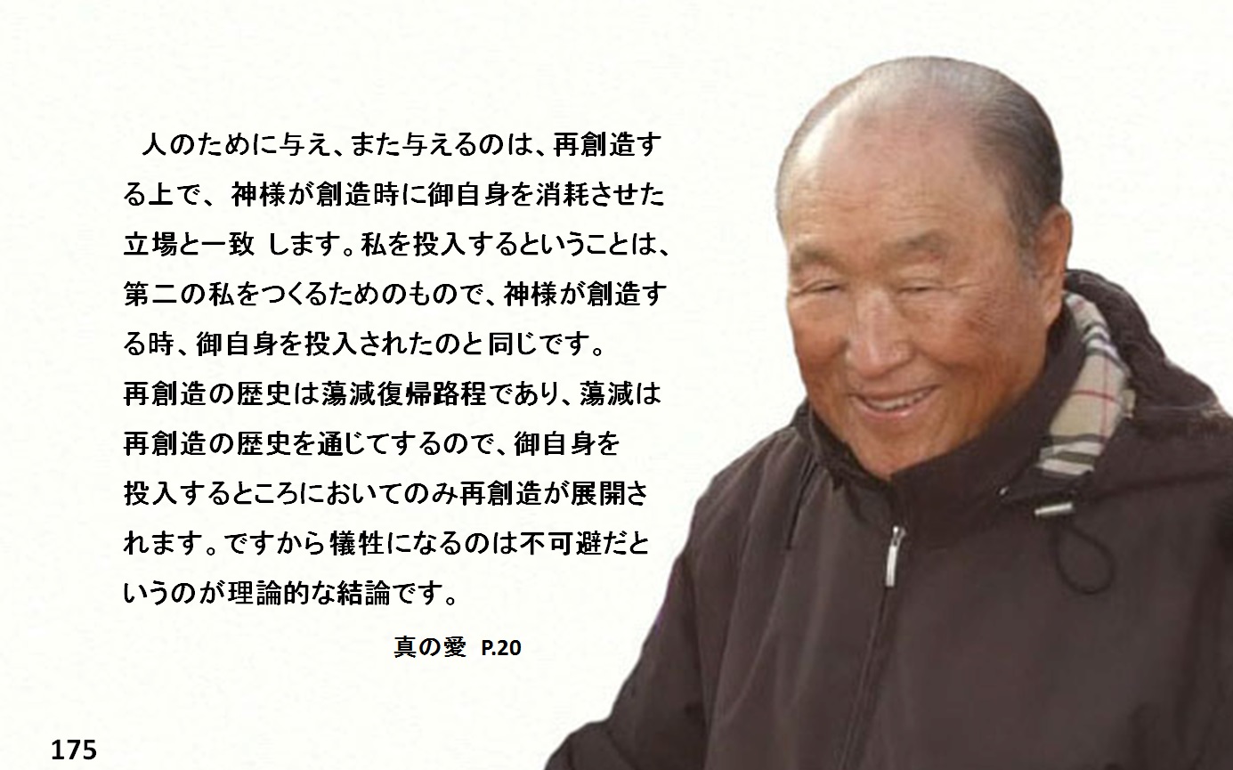 人のために与え、また与えるのは、再創造する上で、神様が創造時に御自身を消耗させた立場と一致します。私を投入するということは、第二の私をつくるためのもので、神様が創造する時、御自身を投入されたのと同じです。再創造の歴史は蕩減復帰路程であり、蕩減は再創造の歴史を通じてするので、御自身を投入するところにおいてのみ再創造が展開されます。ですから犠牲になるのは不可避だというのが理論的な結論です。