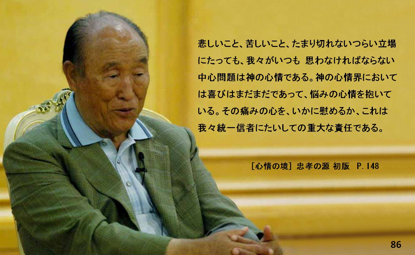 悲しいこと、苦しいこと、たまり切れないつらい立場にたっても、我々がいつも思わなければならない中心問題は神の心情である。神の心情界においては喜びはまだまだであって、悩みの心情を抱いている。その痛みの心を、いかに慰めるか、これは我々統一信者にたいしての重大な責任である。