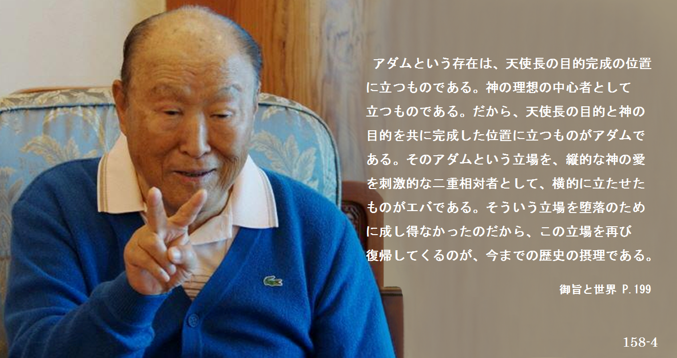 アダムという存在は、天使長の目的完成の位置に立つものである。神の理想の中心者として立つものである。だから、天使長の目的と神の目的を共に完成した位置に立つものがアダムである。そのアダムという立場を、縦的な神の愛を刺激的な二重相対者として、横的に立たせたものがエバである。それが再び一つになった場合には、縦的な愛の力が横的につながることができる。だから、そういう立場を堕落のために成し得なかったのだから、この立場を再び復帰してくるのが、今までの歴史の摂理である。