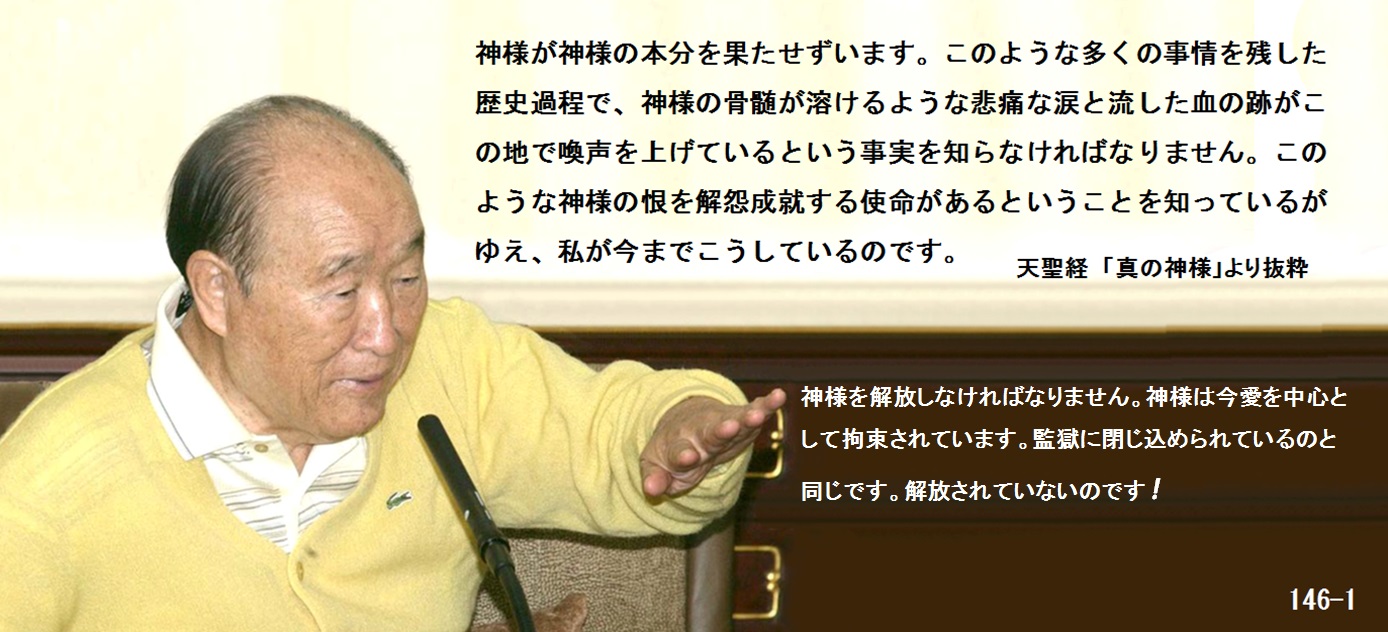神様が神様の本分を果たせずいます。このような多くの事情を残した歴史過程で、神様の骨髄が溶けるような悲痛な涙と流した血の跡がこの地で喚声を上げているという事実を知らなければなりません。このような神様の恨を解怨成就する使命があるということを知っているがゆえ、私が今までこうしているのです。