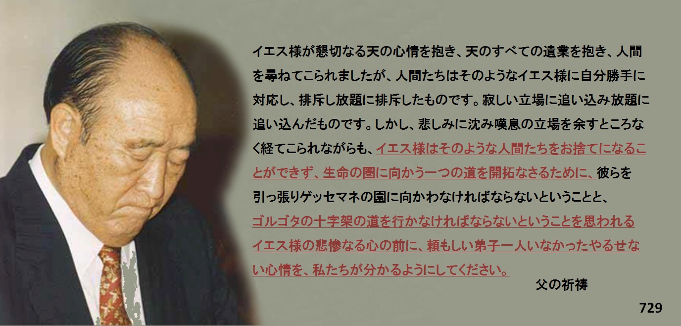 きょう私たちがこのような事実を考えながら、天上に対することができ、孤児のような立場であったイエス様の心情を持って「お父様!」と訴えることができ、その時に心情と通じることができるようにしてください。この者たちをして、心を開き、信じることのできる弟子たちとなるようにしてくださり、イエス様を証すことのできる存在となるよう許諾してくださいますことを、お父様、懇切にお願い申し上げます。