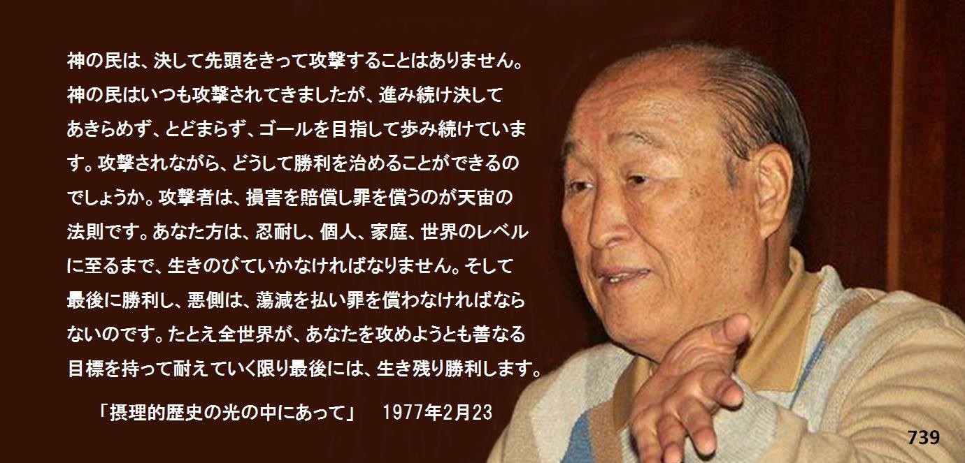 そういう神にある人はこういうでしょう。「神様、あなたは、攻撃しないなんて善良すぎます。あなたに代って私が攻めましょう。」このような人は、神の民と言えますか。神の民は、決して先頭をきって攻撃することはありません。神の民はいつも攻撃されてきましたが、進み続け決してあきらめず、とどまらず、ゴールを目指して歩み続けています。攻撃されながら、どうして勝利を治めることができるのでしょうか。攻撃者は、損害を賠償し罪を償うのが天宙の法則です。あなた方は、忍耐し、個人、家庭、世界のレベルに至るまで、生きのびていかなければなりません。そして最後に勝利し、悪側は、蕩減を払い罪を償わなければならないのです。たとえ全世界が、あなたを攻めようとも善なる目標を持って耐えていく限り最後には、生き残り勝利します。そして全宇宙が、あなたのものとなります。これ以上、拡げようのない程の天宙を所有します。サタンは、攻撃する者の王です。