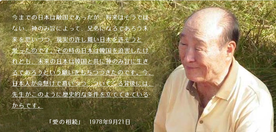 先生は、韓国へ行けば韓国の先生です。日本の帝政時代に相当に拷問されたこともあります。そのことを思うと、日本が滅びる道があれば、それを考えてもおかしくない過去の歴史をもっているのですが、先生はそうではありません。第二次大戦で日本が負けた時、先生を拷問した人たちをみな夜中に呼び出して、「あなたたち、韓国にいたら危ないから逃げなさい」と荷物を積んで送り出した先生です。先生はその時、今までの日本は敵国であったが、将来はそうではない、神のみ旨によって、兄弟になるであろう未来を思いつつ、現実の許し難い日本を許そうと思ったのです。その時の日本は韓国を迫害したけれども、未来の日本は韓国と共に神のみ旨に生きるであろうという願いをもちつつきたのです。今、日本人が命懸けで慕いつつ、ついてくる背後には、先生がこのように歴史的な条件を立ててきているからです。