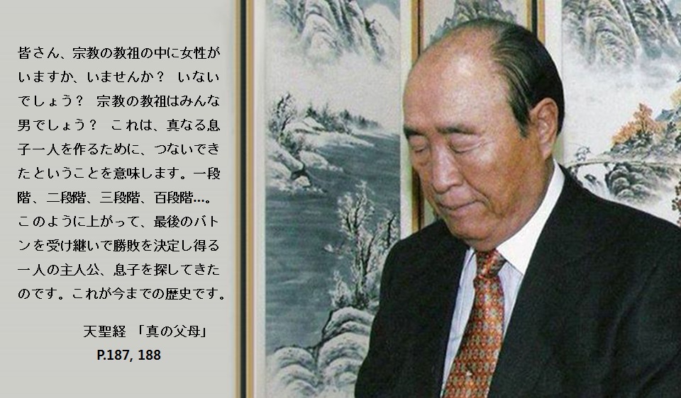 皆さん、宗教の教祖の中に女性がいますか、いませんか? いないでしょう? 宗教の教祖はみんな男でしょう? これは、真なる息子一人を作るために、つないできたということを意味します。一段階、二段階、三段階、百段階…。このように上がって、最後のバトンを受け継いで勝敗を決定し得る一人の主人公、息子を探してきたのです。これが今までの歴史です。(四一・二八)