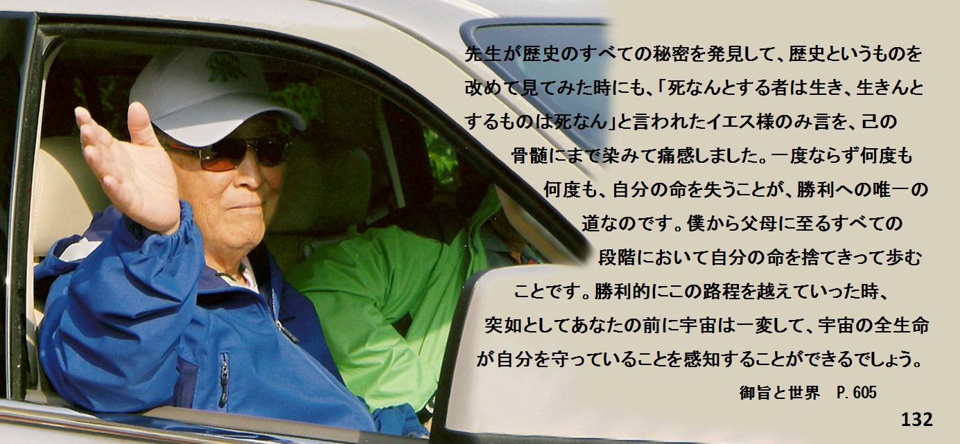 先生が歴史のすべての秘密を発見して、歴史というものを改めて見てみた時にも、「死なんとする者は生き、生きんとするものは死なん」と言われたイエス様のみ言を、己の骨髄にまで染みて痛感しました。一度ならず何度も何度も、自分の命を失うことが、勝利への唯一の道なのです。僕から父母に至るすべての段階において自分の命を捨てきって歩むことです。7年間ただ命を断念して、勝利的にこの路程を越えていった時、突如としてあなたの前に宇宙は一変して、宇宙の全生命が自分を守っていることを感知することができるでしょう。