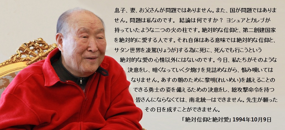 息子、妻、お父さんが問題ではありません。また、国が問題ではありません。問題は私なのです。 結論は何ですか? ヨシュアとカレブが持っていたような二つの火の柱です。絶対的な信仰と、第二創建国家を絶対的に愛する人です。それ自体はある意味では絶対的な信仰と、サタン世界を凌駕する為に死に、死んでも行こうという絶対的な愛の心情以外にはないのです。