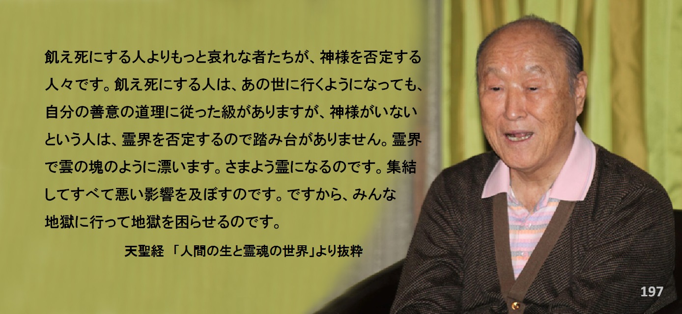 飢え死にする人よりもっと哀れな者たちが、神様を否定する人々です。飢え死にする人は、あの世に行くようになっても、自分の善意の道理に従った級がありますが、神様がいないという人は、霊界を否定するので踏み台がありません。霊界で雲の塊のように漂います。さまよう霊になるのです。集結してすべて悪い影響を及ぼすのです。ですから、みんな地獄に行って地獄を困らせるのです。そのようなことを十分に知って、彼らを生かしてあげなければならないのでこのことをするのです。