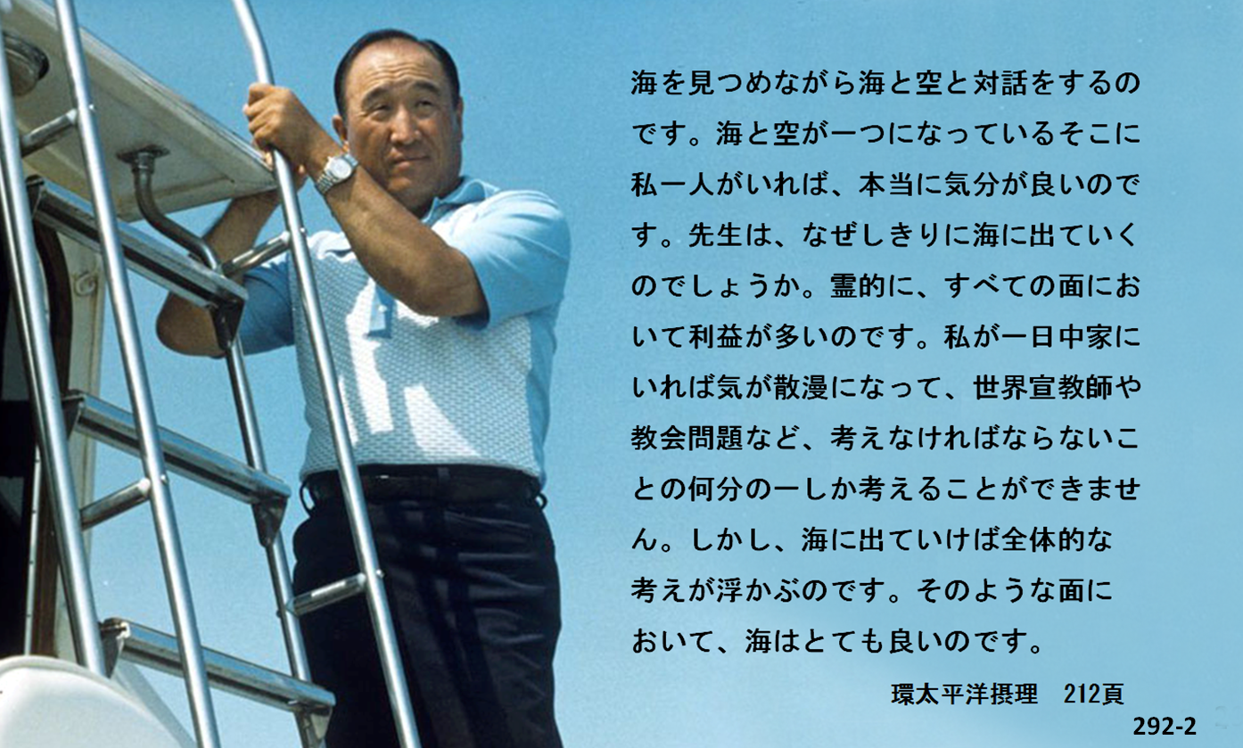 先生は、なぜしきりに海に出ていくのでしょうか。霊的に、すべての面において利益が多いのです。私が一日中家にいれば気が散漫になって、世界宣教師や教会問題など、考えなければならないことの何分の一しか考えることができません。しかし、海に出ていけば全体的な考えが浮かぶのです。そのような面において、海はとても良いのです。