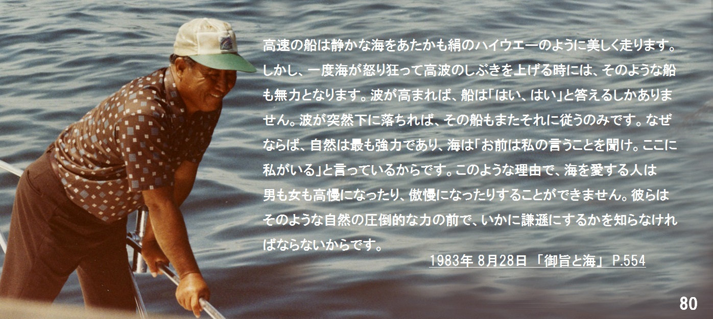 普通の場合、高速の船は静かな海をあたかも絹のハイウエーのように美しく走ります。しかし、一度海が怒り狂って高波のしぶきを上げる時には、そのような船も無力となります。波が高まれば、船は「はい、はい」と答えるしかありません。波が突然下に落ちれば、その船もまたそれに従うのみです。なぜならば、自然は最も強力であり、海は「お前は私の言うことを聞け。ここに私がいる」と言っているからです。このような理由で、海を愛する人は男も女も高慢になったり、傲慢になったりすることができません。彼らはそのような自然の圧倒的な力の前で、いかに謙遜にするかを知らなければならないからです。