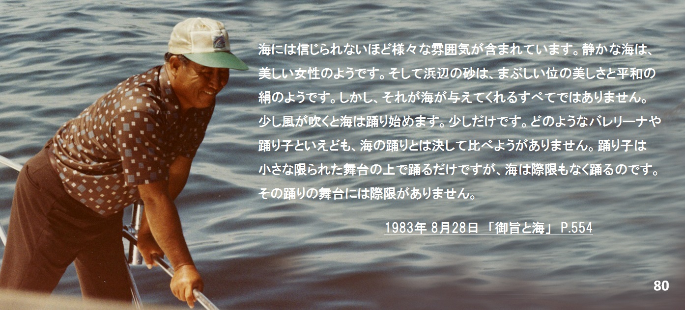 普通の場合、高速の船は静かな海をあたかも絹のハイウエーのように美しく走ります。しかし、一度海が怒り狂って高波のしぶきを上げる時には、そのような船も無力となります。波が高まれば、船は「はい、はい」と答えるしかありません。波が突然下に落ちれば、その船もまたそれに従うのみです。なぜならば、自然は最も強力であり、海は「お前は私の言うことを聞け。ここに私がいる」と言っているからです。このような理由で、海を愛する人は男も女も高慢になったり、傲慢になったりすることができません。彼らはそのような自然の圧倒的な力の前で、いかに謙遜にするかを知らなければならないからです。