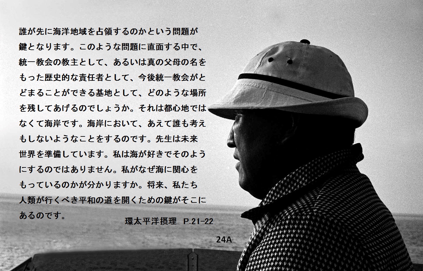 これからの世界を指導することができる人は、海を守ることができる人です。人類が海底の宝物に対して、自分たちのあらゆる権力と文化的背景、そして伝統と国力を投入して開発をしていく時代が来ます。それを開発するためには、誰が先に海洋地域を占領するのかという問題が鍵となります。このような問題に直面する中で、統一教会の教主として、あるいは真の父母の名をもった歴史的な責任者として、今後統一教会がとどまることができる基地として、どのような場所を残してあげるのでしょうか。 それは都心地ではなくて海岸です。海岸において、あえて誰も考えもしないようなことをするのです。
