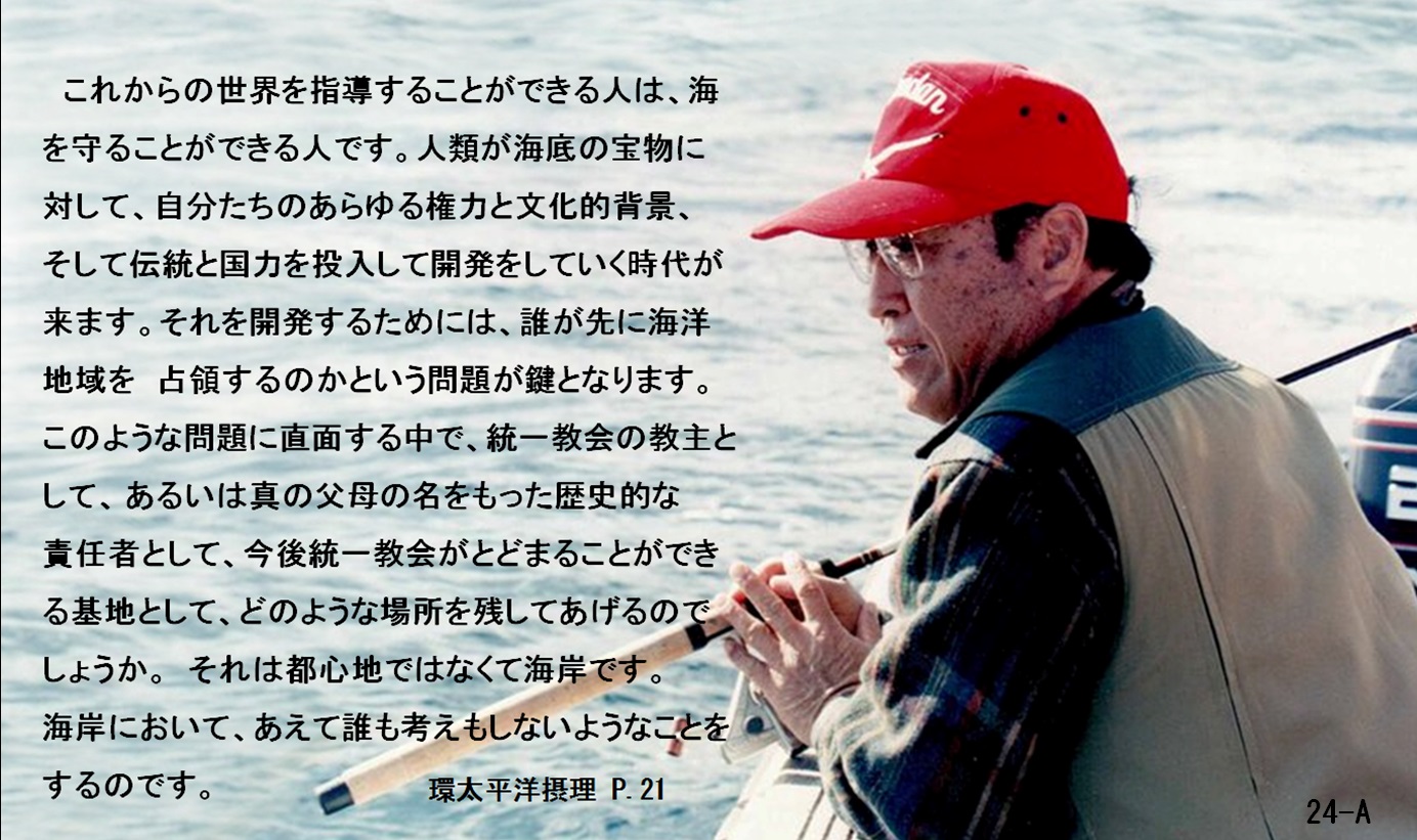 海を好きにならなければなりません。開拓しなければなりません。陸地の3倍もある海を無視することはできません。今後、誰が海底に眠っている水産資源を開発するのでしょうか。地上には金銀、石油があるといいますが、海は陸地の3倍なので、その3倍が埋まっているのです。今からその開発に着手しなければなりません。ゆえに、統一教会員は家を売ろうと何をしようと、どのようなことをしてでも水域を確保しなさいというのです。