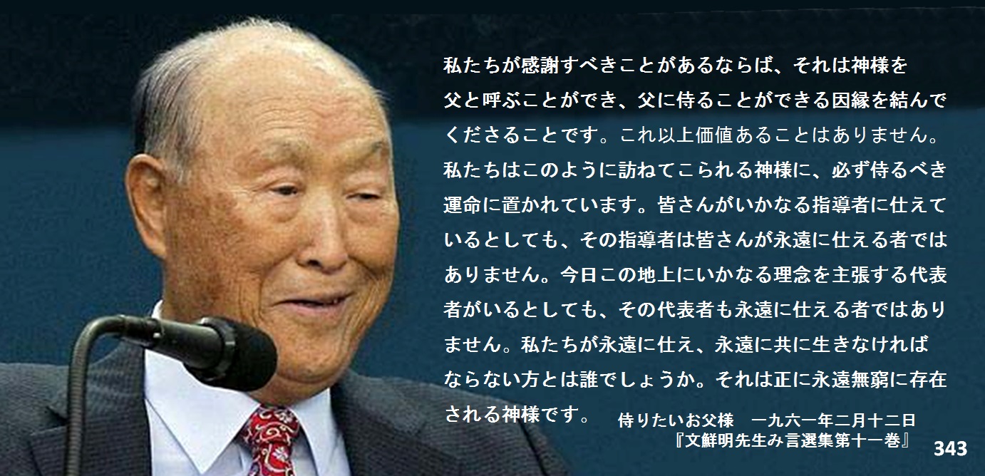 生涯、真の父母様に侍り、天の摂理とみ旨のために歩まれた神山威先生が、2016年12月12日に聖和されました。「毎日わずかな時間でもいいので、み言を訓読してください」という先生の遺志を受け継ぎ、これまで通りみ言を配信してまいります。
