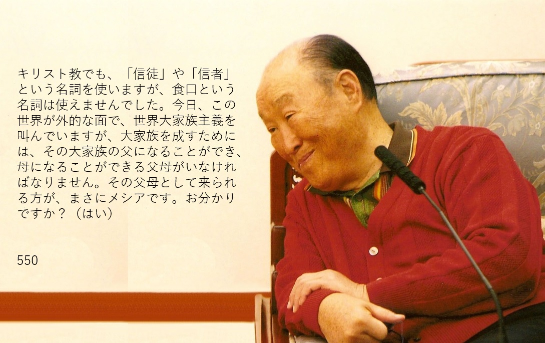 キリスト教でも、「信徒」や「信者」という名詞を使いますが、食口という名詞は使えませんでした。今日、この世界が外的な面で、世界大家族主義を叫んでいますが、大家族を成すためには、その大家族の父になることができ、母になることができる父母がいなければなりません。その父母として来られる方が、まさにメシアです。お分かりですか?(はい)。