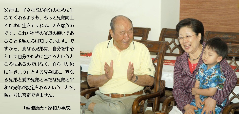 父母は、子女たちが自分のために生きてくれるよりも、もっと兄弟同士でために生きてくれることを願うのです。これが本当の父母の願いであることを私たちは知っています。ですから、真なる兄弟は、自分を中心として自分のために生きろというところにあるのではなく、自ら「ために生きよう」とする兄弟間に、真なる兄弟と愛の兄弟と幸福な兄弟と平和な兄弟が設定されるということを、私たちは否定できません。(77―265、1975・4・14)