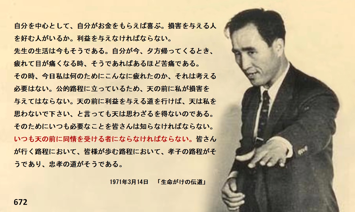 いつも天の前に同情を受ける者にならなければならない。皆さんが行く路程において、皆様が歩む路程において、孝子の路程がそうであり、忠臣の路程がそうであり、忠孝の道がそである。