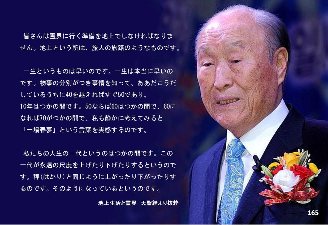 人間の一生は短いのです。生涯において10年がいつ過ぎたのか知らないのです。結婚して30年以内に、すべてのものが決定されるのです。それゆえに、人生の道はいつも待っていません。忙しいのです。そして、死ななくてはなりません。死なないですか。死なない自信がありますか。死ななくてはなりませんね。死ねばどこへ行きますか。霊界があることを知っていますか。先生は霊界を知っているがゆえに一生をかけてこの仕事をしています。世界をすべて料理しながらです。この世はつかの間です。10カ月の腹中生活と同じです。