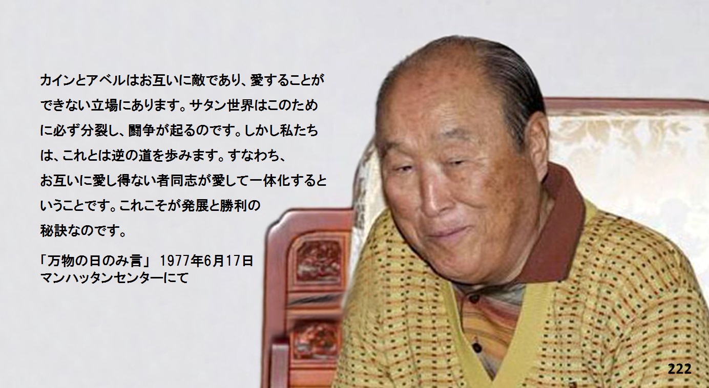カインとアベルはお互いに敵であり、愛することができない立場にあります。サタン世界はこのために必ず分裂し、闘争が起るのです。しかし私たちは、これとは逆の道を歩みます。すなわち、お互いに愛し得ない者同志が愛して一体化するということです。これこそが発展と勝利の秘訣なのです。アベルとカインの関係において、アベルはより神様に愛される立場にあり、カインはアベルを通して神様の愛を受けるべき立場にあります。しかし、だからといってカインの立場にある者は、アベルの立場にある者に無条件で従うのが当然だ、などと考えることは誤りです。アベルの立場にある者は、カインの立場にある者が従順に従ってくることができるように、仕向けなければなりません。