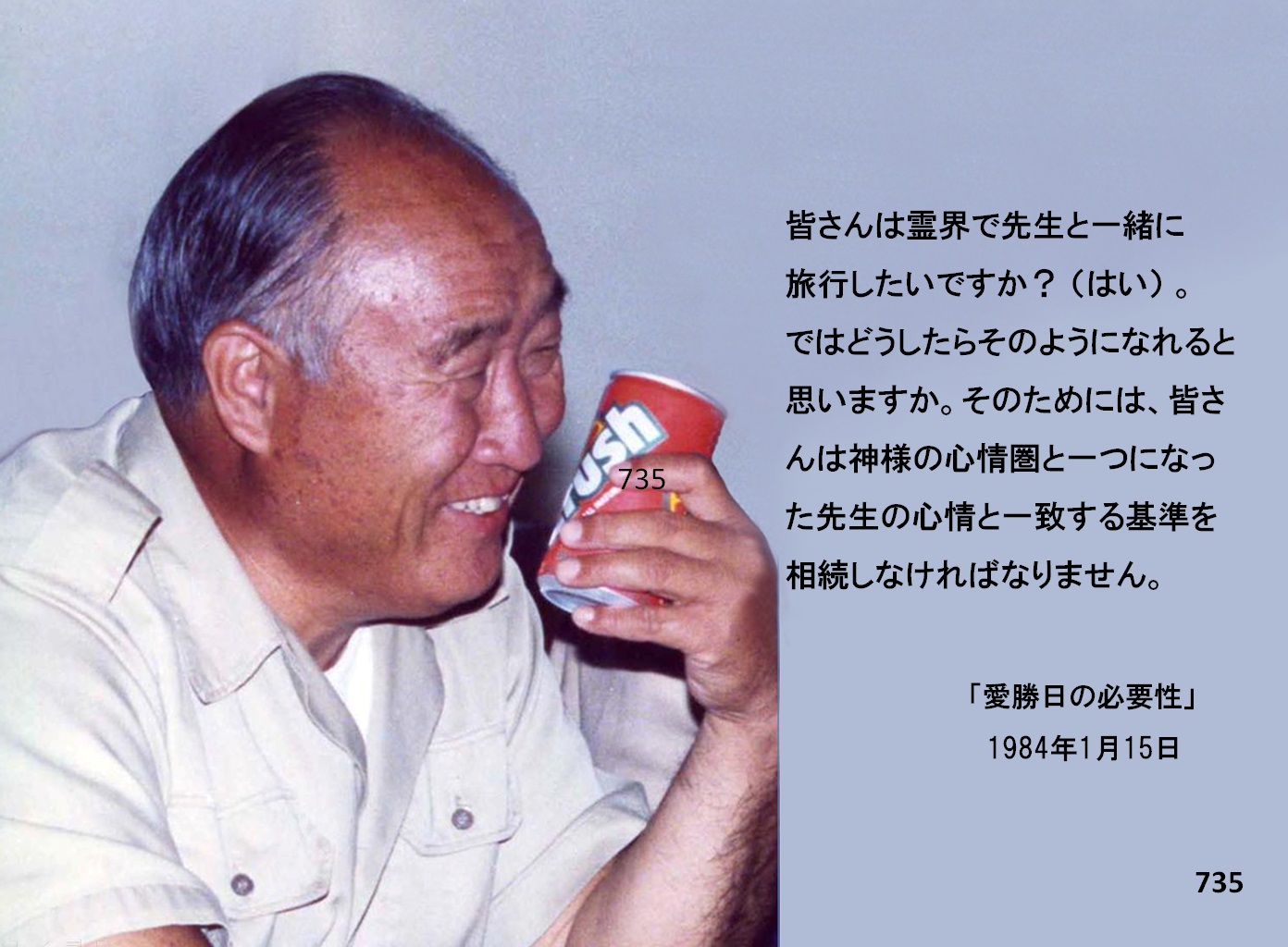 皆さんは霊界で先生と一緒に旅行したいですか? (はい) 。ではどうしたらそのようになれると思いますか。そのためには、皆さんは神様の心情圏と一つになった先生の心情と一致する基準を相続しなければなりません。この無限なる宇宙が神様の愛に完全に一致した時、一瞬で到達できるのです。