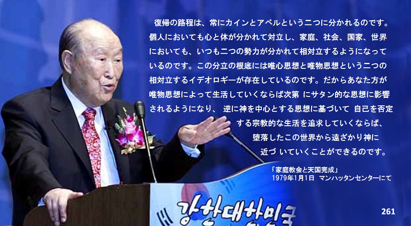 復帰の路程は、常にカインとアベルという二つに分かれるのです。個人においても心と体が分かれて対立し、家庭、社会、国家、世界においても、いつも二つの勢力が分かれて相対立するようになっているのです。今日の世界においては自由世界と共産世界という二つの陣営が分かれて対立していますが、この分立の根底には唯心思想と唯物思想という二つの相対立するイデオロギーが存在しているのです。だからあなた方が唯物思想によって生活していくならば次第にサタン的な思想に影響されるようになり、逆に神を中心とする思想に基づいて自己を否定する宗教的な生活を追求していくならば、堕落したこの世俗世界から遠ざかり神に近づいていくことができるのです。