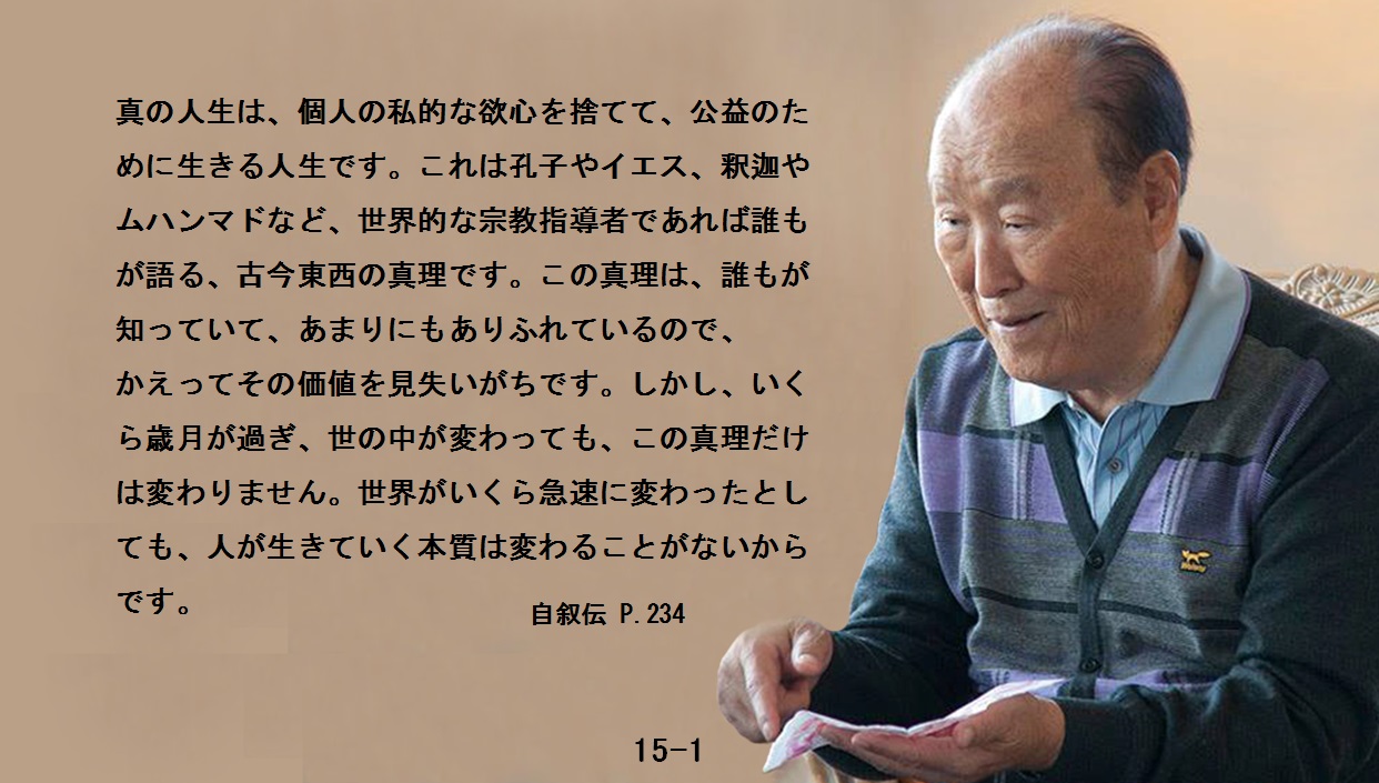 真の人生は、個人の私的な欲心を捨てて、公益のために生きる人生です。これは孔子やイエス、釈迦やムハンマドなど、世界的な宗教指導者であれば誰もが語る、古今東西の真理です。この真理は、誰もが知っていて、あまりにもありふれているので、かえってその価値を見失いがちです。しかし、いくら歳月が過ぎ、世の中が変わっても、この真理だけは変わりません。世界がいくら急速に変わったとしても、人が生きていく本質は変わることがないからです。