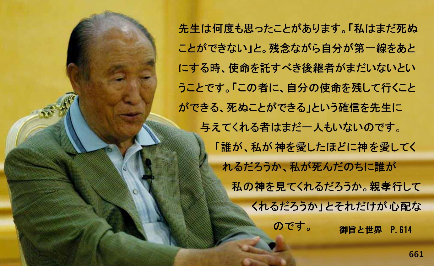 先生は何度も思ったことがあります。「私はまだ死ぬことができない」と。残念ながら自分が第一線をあとにする時、使命を託すべき後継者がまだいないということです。「この者に、自分の使命を残して行くことができる、死ぬことができる」という確信を先生に与えてくれる者はまだ一人もいないのです。「誰が、私が神を愛したほどに神を愛してくれるだろうか、私が死んだのちに誰が私の神を見てくれるだろうか。親孝行してくれるだろうか」とそれだけが心配なのです。誰か「私が神様を見ますから、先生は後ろに立って見ていてください」と言う人がいるとすれば、その人こそは歴史においても私たちの教会においても主流的人物となり、永遠に滅びることなく、その子孫はアブラハムの子孫のごとく栄えることでしょう。