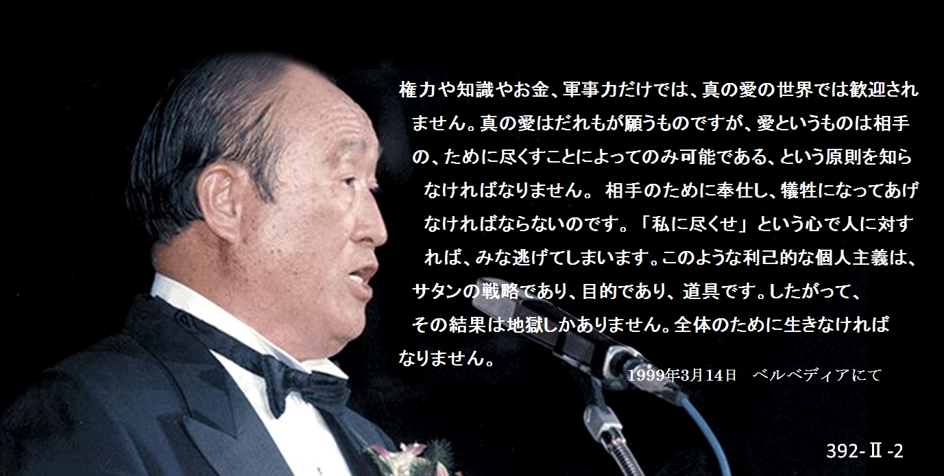 権力や知識やお金、軍事力だけでは、真の愛の世界では歓迎されません。真の愛はだれもが願うものですが、愛というものは相手のために尽くすことによってのみ可能である、という原則を知らなければなりません。相手のために奉仕し、犠牲になってあげなければならないのです。 「私に尽くせ」という心で人に対すれば、みな逃げてしまいます。このような利己的な個人主義は、サタンの戦略であり、目的であり、道具です。したがって、その結果は地獄しかありません。
