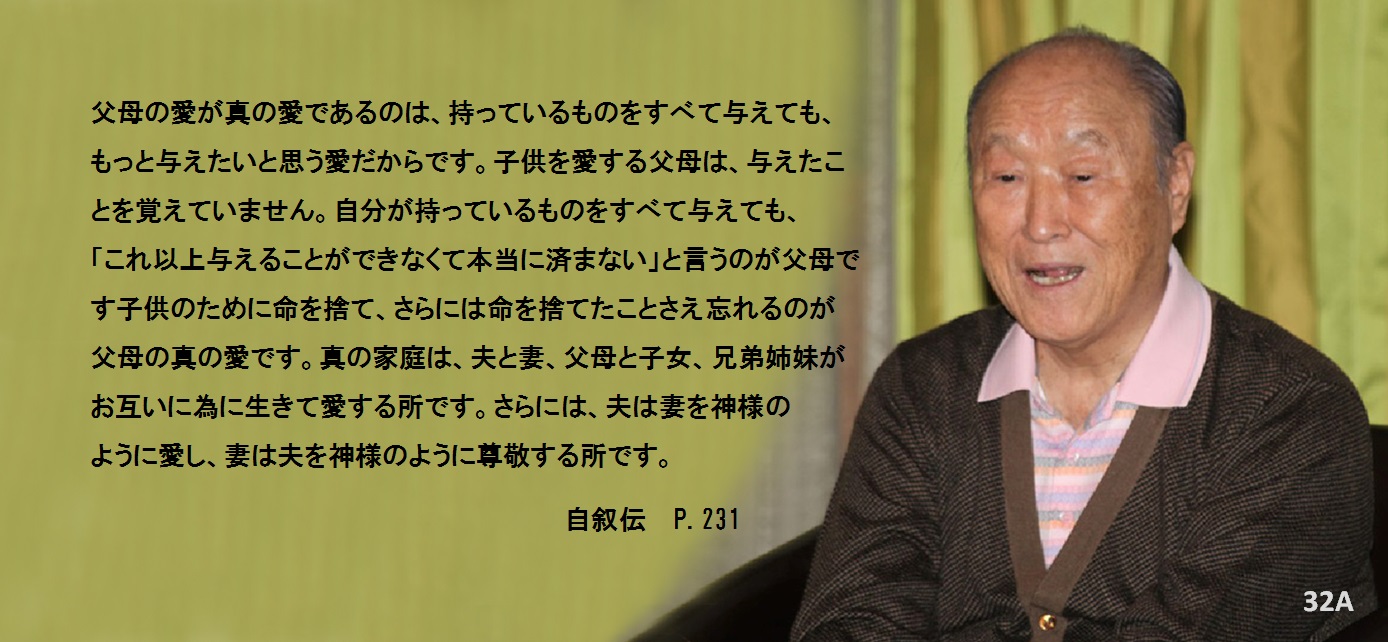 家庭というのは、人類愛を学び教える学校です。父母の温かい愛を受けて育った子供は、外に出ていけば、家で学んだとおりに、困っている人を愛の心で助けるでしょう。また、兄弟姉妹の間で情け深い愛を分かち合って育った子供は、社会に出て隣人と厚い情を分かち合って生きていくでしょう。愛で養育された人は、世の中のどんな人でも家族のように思うものです。自分の家族のように思って人に仕え、人に自分のものを分けてあげる愛の心は、真の家庭から始まります。
