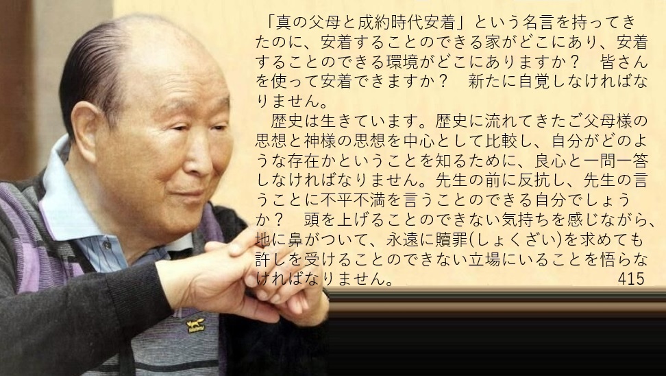 歴史は生きています。歴史に流れてきたご父母様の思想と神様の思想を中心として比較し、自分がどのような存在かということを知るために、良心と一問一答しなければなりません。先生の前に反抗し、先生の言うことに不平不満を言うことのできる自分でしょうか? 頭を上げることのできない気持ちを感じながら、地に鼻がついて、永遠に贖罪を求めても許しを受けることのできない立場にいることを悟らなければなりません。